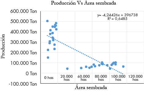 En la tabla 2, se reflejan los datos proporcionados por el análisis de regresión realizado con los datos de área sembrada y producción. Los datos muestran que hay una relación entre la producción respecto al área sembrada de un 64,84% reflejado en el coeficiente de determinación (R^2). También se muestran los valores de intercepción y de la variable con los cuales se pueden calcular unos estimados de producciones futuras.