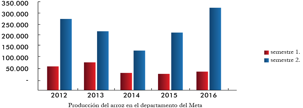 No obstante, para el segundo semestre de los últimos cinco años del cuarto censo arrocero, el comportamiento productivo del arroces en el departamento del meta, se mostró, que el año de mayo producción de arroz fue el año 2016 con una producción de 343.717 Toneladas de arroz, sin embargo la menor producción para este semestre fue en el año 2014 con una producción de arroz de 150.769 Toneladas de arroz, resaltando que para el año 2012 la producción fue alta en 275.707 toneladas de arroz y para los años 2013 y 2014 disminuyeron significativamente (Fedearroz, 2017).