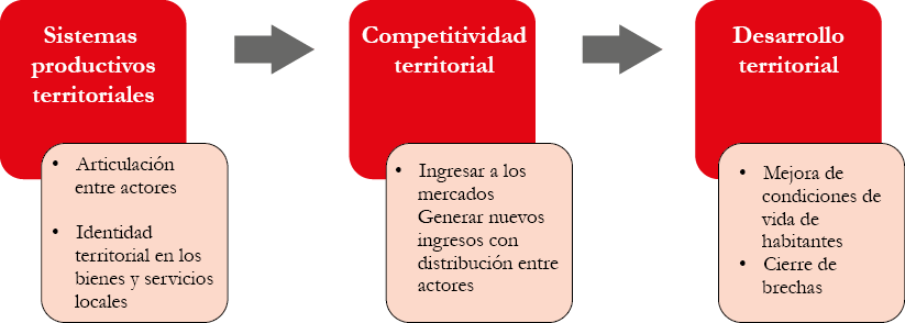 En el momento en el que se analiza un territorio respecto a otro se deben tener en cuenta los elementos que provocan una particularidad en cada uno de ellos (Sack, 1986). Básicamente, esos elementos se refieren a las condiciones históricas, económicas, sociales, políticas y geográficas que determinan la construcción de ese territorio. En esta medida, se menciona que el territorio necesariamente es un proceso multidimensional, por lo que su estudio debe realizarse de esa misma manera, entendiendo que existen relaciones materiales e inmateriales que van a ser abordadas desde las categorías de competitividad territorial, sistemas productivos territoriales y desarrollo territorial, como se muestra en la figura 1.