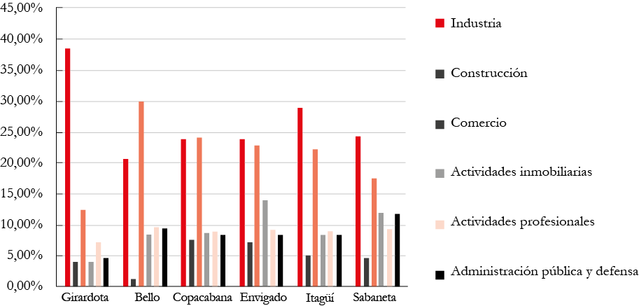 La economía del Valle de Aburrá, en general, es la que más aporta a todo el departamento de Antioquia, representando un 68,6 % de la economía antioqueña (Cámara de Comercio de Medellín, 2018). Sin embargo, como se ha explicado en este artículo, existen diferencias sustanciales al interior de esta subregión. Estas diferencias se pueden observar en la figura 3, la cual indica que los municipios de la zona norte tienden a tener una mayor concentración en una o dos actividades, mientras que en la zona sur se observa una mayor diversificación económica. Si bien ambas zonas tienen como principales actividades la industria y el comercio, se observa que en el norte hay una mayor dependencia de estas frente al sur, que cuenta con otras que pueden hacer algún contrapeso. Esto muestra una mayor diversificación económica en el sur, que está tendiendo a concentrarse en actividades del sector terciario de la economía, es decir, los servicios. Por su parte, el norte se sigue concentrando en el sector secundario principalmente.