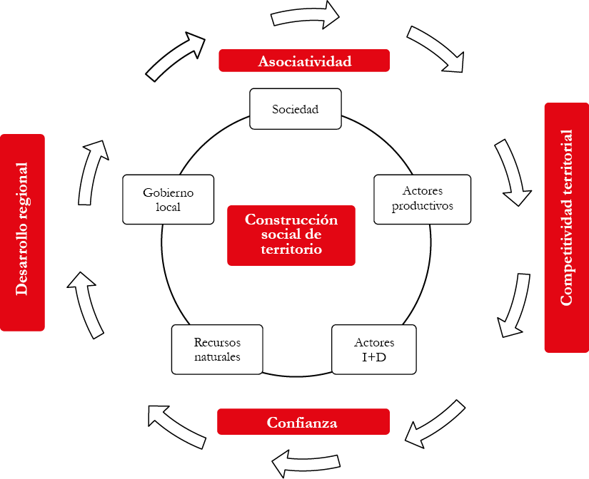 En la figura 2 se recopila este modelo del sistema productivo territorial, donde la asociatividad y la confianza entre los diferentes actores del territorio son las que van a permitir que se llegue a un desarrollo regional y a una competitividad territorial.