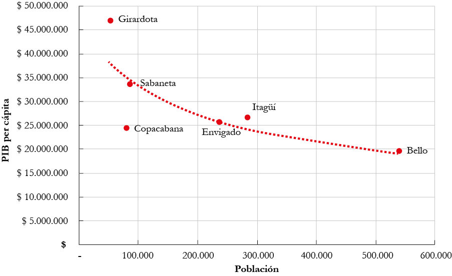 En cuanto a la población y el PIB de cada uno de los municipios analizados, es de anotar que el mayor PIB per cápita se encuentra entre los municipios del sur y, al analizarlos en conjunto, pareciera encontrarse una relación inversa entre el tamaño de la población y el PIB per cápita (figura 4). Esta relación indica que entre mayor sea la población del municipio, menor será su PIB per cápita, lo cual no es una conclusión generalizada en economía, pero entre estos municipios sí parece darse. Lo interesante de este dato es que un municipio como Girardota, con bajos niveles de población, se encuentra como el que tiene un mayor PIB per cápita. Este caso en particular tiene relación con la industria intensiva en capital que se está atrayendo en el municipio y que genera un valor agregado relativamente alto, lo que se refleja en el PIB per cápita. Sin embargo, este indicador se debe matizar con el análisis de otras variables socioeconómicas para observar si sí es positivo para el territorio contar con un PIB per cápita tan alto.