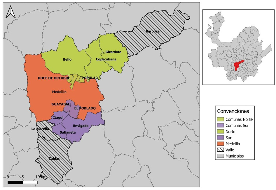 Para el estudio se va a entender como zona norte el espacio comprendido por los municipios de Bello, Copacabana y Girardota, así como las comunas Castilla, 12 de Octubre, Popular y Santa Cruz del municipio de Medellín. Por su parte, la zona sur estará compuesta por los municipios de Envigado, Itagüí y Sabaneta, así como por las comunas El Poblado y Guayabal de Medellín (Ver Mapa 1). Se seleccionaron estos lugares porque en la actualidad cuentan con un proceso de conurbación en cada una de las zonas que indican una estrecha relación con su interior. Así mismo, comparten dinámicas generales en cuanto a niveles de desarrollo, actividad económica y servicios públicos y sociales en común.