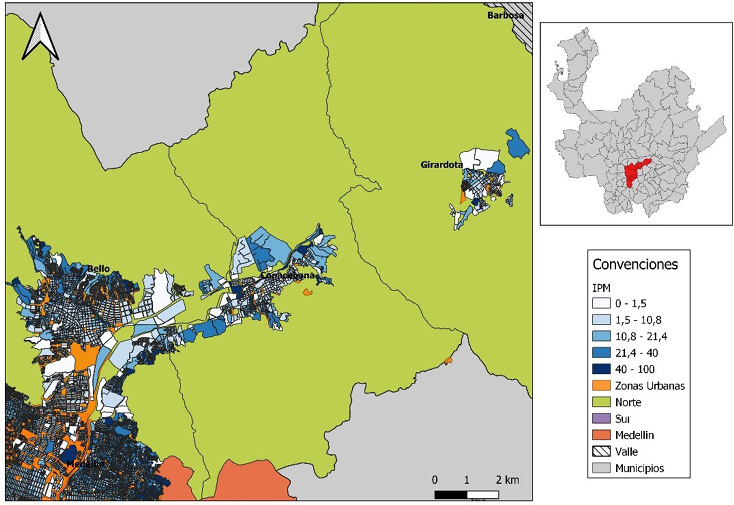 En este orden de ideas, en la actualidad, en el Valle de Aburrá se observa una diferencia amplia entre la zona norte y la zona sur. En el sur se localiza la mayor cantidad de empresas y también los mayores niveles de ingresos, mientras que en el norte se localiza una menor cantidad de empresas y se está definiendo como lugar de residencia de la clase media – baja que trabaja en Medellín y en el sur del Valle de Aburrá. Con esto en mente, el presente artículo tiene como finalidad analizar los aspectos territoriales que explican la diferenciación en cuanto al desarrollo de ambas zonas.