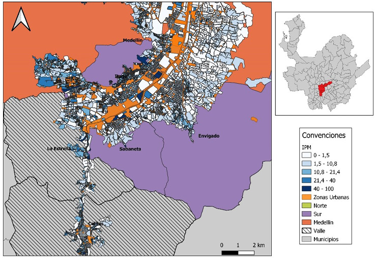 Adicionalmente, en cada uno de los municipios de la zona norte se observa una concentración de población pobre en su periferia urbana, lo que muestra una posible separación entre las clases sociales alrededor del Valle de Aburrá. Esto último debido a que en la zona sur la tendencia es diferente, ya que su periferia urbana presenta la menor incidencia de pobreza multidimensional, mientras que en las zonas centrales aparece, en una menor medida que en la zona norte, una población pobre, lo cual soporta la hipótesis inicial de esta investigación.
