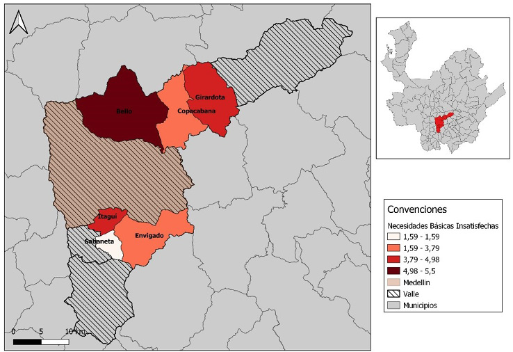 El índice de necesidades básicas insatisfechas (NBI) para el año 2018, que es el indicador oficial de pobreza usado en Colombia por el Gobierno Nacional, es presentado en el mapa 5. Se observa que hay diferencias entre las zonas norte y sur, siendo esta última la que presenta, en promedio, las menores NBI. Sin embargo, cabe resaltar que dicho indicador, tanto para los municipios de la zona norte como para los de la zona sur, es de un solo dígito, lo que representa niveles muy bajos respecto al promedio nacional (14.28), lo cual indica que, por ejemplo, para el caso de Bello, donde el índice es el más alto, menos del 5,5 % de los hogares poseen NBI, seguido por Girardota e Itagüí, donde menos del 4,98 % de los hogares registran NBI.