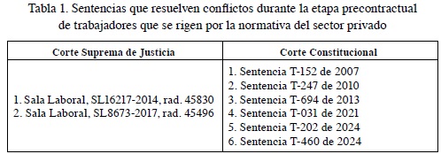 etapa precontractual, relación laboral, oferta laboral, oferta de trabajo, proceso de contratación, selección de personal. En nuestra búsqueda histórica, que abarca todos los registros digitales existentes hasta enero del año 2025, encontramos dos sentencias de la Sala Laboral de la Corte Suprema de Justicia y veintiún sentencias de la Corte Constitucional. De las veintiún sentencias de tutela que aparecieron en la búsqueda inicial, solo seis estudiaron casos en los que el régimen aplicable es el de los trabajadores privados, es decir, la regulación del Código Sustantivo del Trabajo (Tabla 1), mientras que en el resto de los casos se trataba de trabajadores del sector público13, razón por la cual nuestro análisis se concentra en estas últimas seis sentencias.