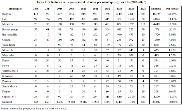 De acuerdo con los datos recopilados por el Sistema de Información de la Conciliación, el Arbitraje y la Amigable Composición (SICAAC) del Ministerio de Justicia y del Derecho de Colombia, desde enero de 2016 (fecha inicial de los datos) y hasta enero de 2025 (mes anterior a la entrada en vigencia de la Ley 2445 de 2025) se habían presentado en todo el territorio nacional 34.019 solicitudes de apertura del trámite de negociación de deudas de personas naturales no comerciantes (en promedio, 3.684 solicitudes por año, sin contar 2025). De estas, solamente 13.795 (el 40,55%) culminaron con un acuerdo de pago entre los deudores y sus acreedores. Por su parte, 13.084 de estos trámites de insolvencia (el 38,46%) fracasaron durante la etapa de negociación, lo que implicó el inicio forzoso del proceso de liquidación patrimonial. Los municipios con mayor número de solicitudes durante todo el período fueron Bogotá, Cali, Medellín, Bucaramanga, Barranquilla, Cúcuta, Valledupar, Montería, Manizales, Pasto, Neiva, Villavicencio, Sincelejo, Pereira, Santa Marta e Ibagué. Estos representan más del 87,07% del total de solicitudes presentadas, dejando el restante 12,93% de las solicitudes a otras 164 ciudades (Tabla 1). En los municipios con mayor número de solicitudes, que resultan ser capitales de departamento y sede de distintos distritos judiciales, naturalmente se presentaron también el mayor número de fracasos del trámite de negociación.