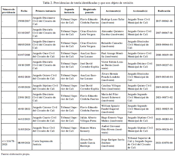 Con todo lo anterior, se tomó la decisión metodológica de revisar los boletines jurisprudenciales publicados por los tribunales seleccionados, así como las sentencias que estos tuviesen publicadas en sus sistemas de relatorías en sus páginas web oficiales (en caso de que las tuviesen). Además, con el propósito de evitar cualquier sesgo inducido al estudio por la falta de revisión, se consultó la jurisprudencia publicada por la Sala de Casación Civil de la Corte Suprema de Justicia. Al final, tras las búsquedas propuestas, no se identificaron decisiones judiciales que abordasen de forma directa la figura del descargue de deudas, su interpretación o desarrollo. Empero, se encontraron solamente once fallos de tutela de segunda instancia proferidos por el Tribunal Superior de Cali y uno de primera instancia de la Corte Suprema de Justicia que resultan relevantes para los fines de esta investigación cualitativa (Tabla 2).