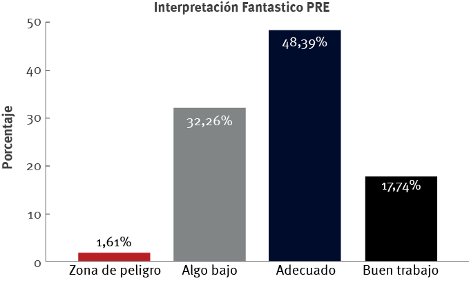 Se determinó a través del análisis del cuestionario fantástico pre por ítems que los estudiantes cuentan con el apoyo de familiares y amigos para mantener un estilo de vida saludable durante su jornada académica. Sin embargo, hace falta mayor esfuerzo, pues se nota un nivel bajo de actividad física en comparación con los valores reales, al igual que el régimen nutricional, incidiendo de algún modo en la conducta y motivación para mantener un estilo de vida saludable.