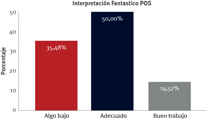 El análisis de las estadísticas fundamentado en la escala tipo Likert de 0 a 100 se desarrolla según las consideraciones propuestas por Ferrer, et al. (2014): < 39 implica un estilo de vida que encuentra en riesgo o zona de peligro; > 40 y < 59 indica un puntaje bajo que puede mejorar; > 60 y < 69 se considera un estilo de vida adecuado; > 70 y < 84 supone un buen trabajo de autocuidado; y, por último > 85 se considera un estilo de vida fantástico.