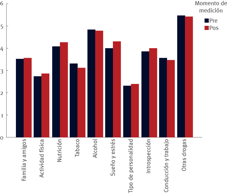 En relación a la introspección se tiene que en el pos los estudiantes toman conciencia del estilo de vida que han llevado, lo cual contribuye positivamente en su calidad de vida en la variable conducción y trabajo no hubo ningún cambio en el pos, pues se observa que esta es superada porcentualmente en el pre, lo que indica que continuaron la rutina acostumbrada, por último, se tiene la variable otras drogas que denota un incremento muy superficial en el pre. En líneas generales a los hallazgos puede afirmarse que estadísticamente no hay una significancia entre las variables pre y pos.