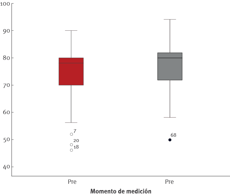 El diagrama de bigotes relacionado con la aplicación del cuestionario fantástico pre muestra que hay una dispersión en cuanto a la distribución de datos. Mientras que, el fantástico pos pone en evidencia un equilibrio en la dispersión y distribución de los datos, denotando normalidad en los mismos. En líneas generales, el diagrama exhibe una independencia que se deriva del valor p igual o equivalente a 0,771 (p=0,771), el cual expresa el nivel de significancia bilateral. Dado que se requiere que el valor p es mayor a 0,05 se acepta la hipótesis nula (HO > 0,05) y se rechaza la hipótesis alternativa (Ha).